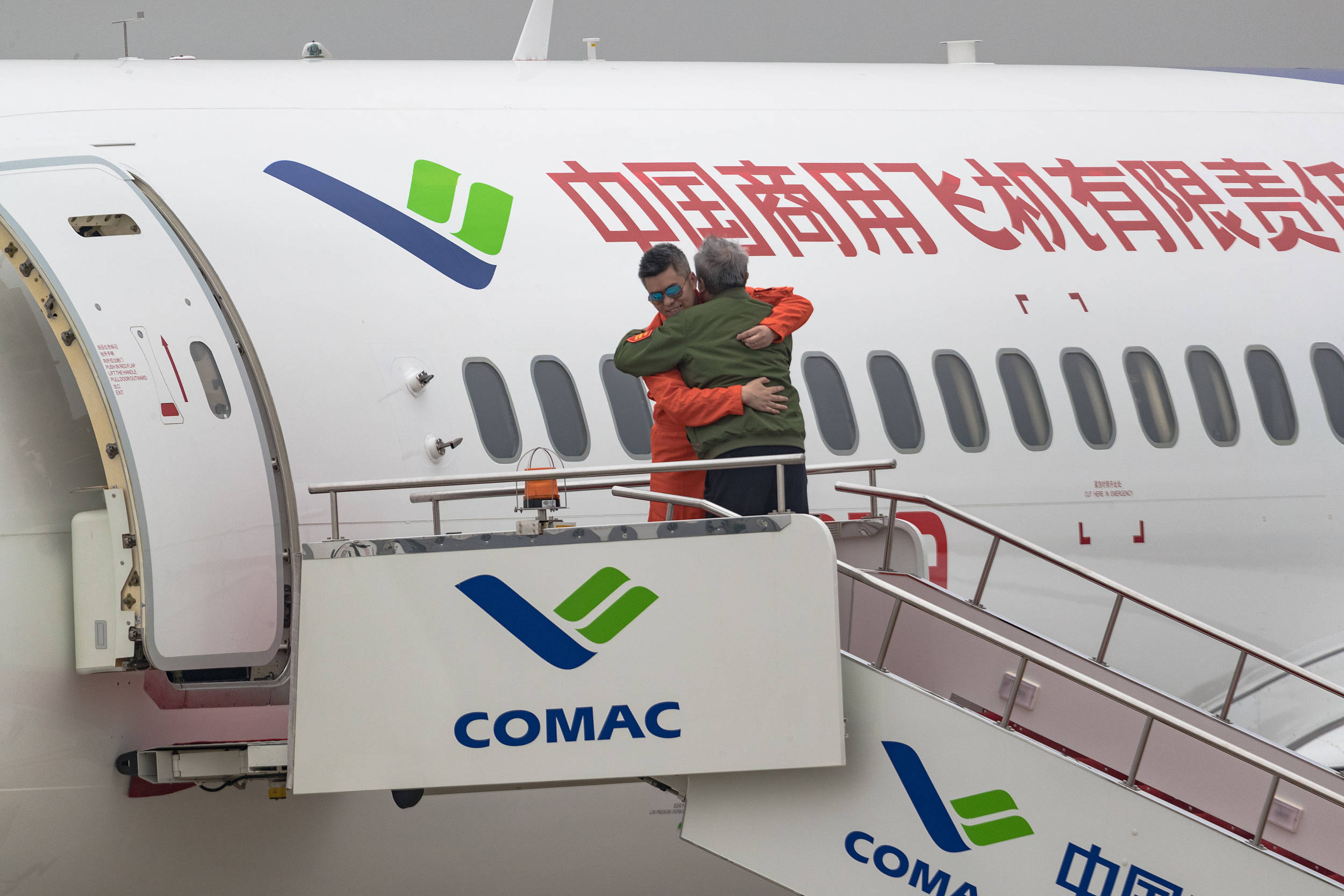 2017年5月5日,C919在上海浦東機場首飛成功。總師吳光輝與首飛機長蔡俊激動的擁抱。圖自視覺中國