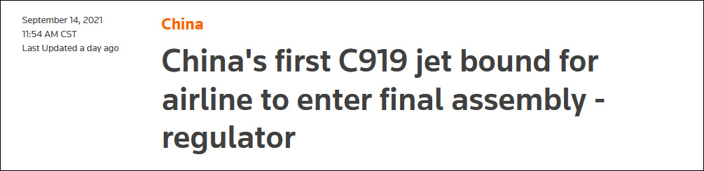 綜合中國民航網和路透社9月14日報道,中國航空監管機構週一(13日)透露,交付給中國東方航空公司的首架C919客機即將進入總裝階段,並預計於年底前交付。