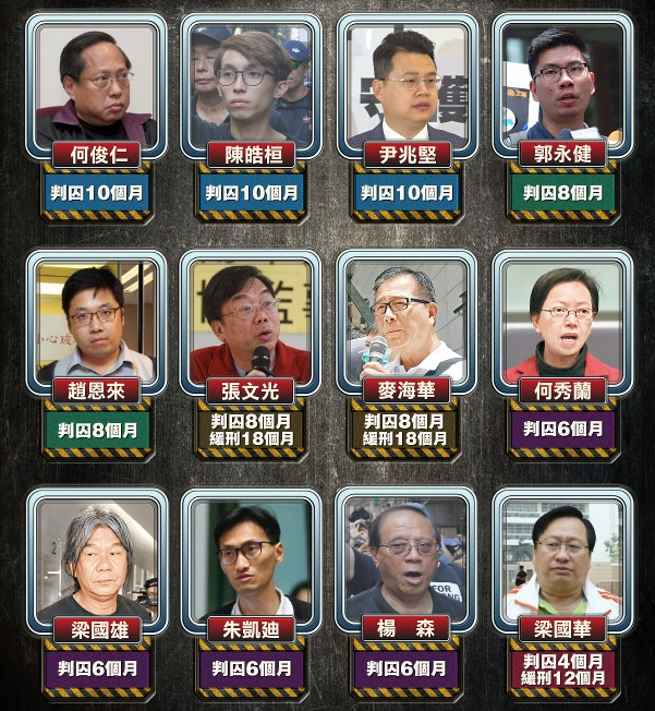 承認2項罪名的何俊仁、陳皓桓及尹兆堅均被判10個月,其中何俊仁、陳皓桓的刑期可以與早前的案件同期執行;同樣承認2項罪名的張文光、郭永健、趙恩來及麥海華,都被判8個月,其中張文光和麥海華獲准緩刑18個月。