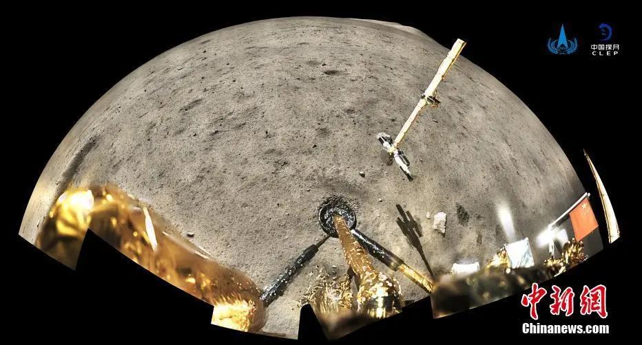 圖為嫦娥五號着陸器和上升器組合體全景相機環拍成像,五星紅旗在月面成功展開。國家航天局 供圖