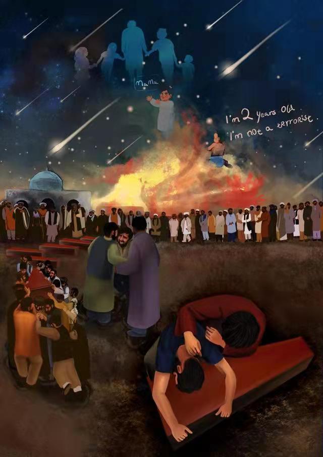 趙立堅向在場記者展示一幅漫畫,描繪了阿富汗一場不同尋常的葬禮。趙立堅表示,經新華社海外社交媒體賬號播發後,令許多海外網友唏噓淚目。8月29日,美軍發動空襲,炸燬阿富汗首都喀布爾的一處民宅,炸死了一家10口,包括7個孩子。事後美軍只是發表聲明稱,將會評估空襲造成的平民傷亡。瑪麗卡和蘇瑪雅只有兩歲,在空襲中被炸身亡。這幅漫畫因此取名《兩歲“恐怖分子”的葬禮》。漫畫描述的是7個夭折的孩子下葬的瞬間。畫面中心是挖好的木坑,大小不一的棺材依次排開,送葬的人們正將一口棺材抬進木坑。