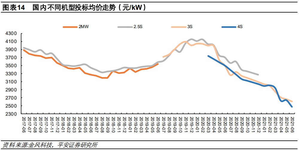 隨着招標機型的大型化,2021年以來,風機招標價格呈現較明顯的下降。根據近期中標情況,三北、西南地區大型風電項目的風機中標價格已低至2300-2500元/kW,較2020年初的價格高點呈現大幅下降。東中南部地區分散式風電項目的風機產品一般單位千瓦掃風面積更大,價格相對更高,以金風科技 GW150-3.0、GW165-4.0等典型風機產品為例,中標價格已經回落至 3000元/kW 以內。