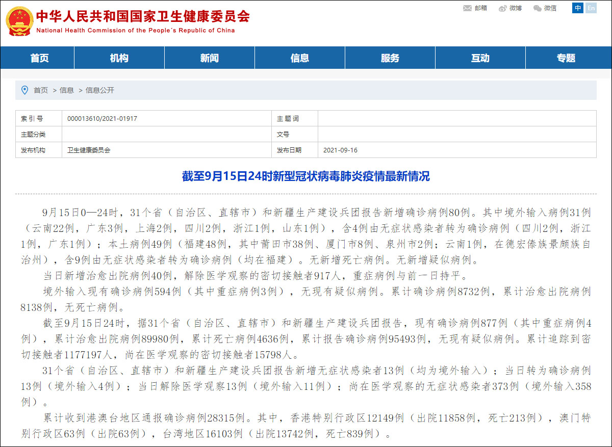 截至9月15日24時,據31個省(自治區、直轄市)和新疆生產建設兵團報告,現有確診病例877例(其中重症病例4例),累計治癒出院病例89980例,累計死亡病例4636例,累計報告確診病例95493例,無現有疑似病例。累計追蹤到密切接觸者1177197人,尚在醫學觀察的密切接觸者15798人。