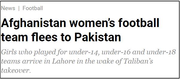 據阿拉伯半島電視台(Al Jazeera)當地時間15日消息,在塔利班重新掌權一個月後,32名13至18歲的阿富汗國家青少年女子足球隊的成員已經越過阿富汗南部托爾卡姆口岸(Torkham Port)逃往巴基斯坦。據巴基斯坦新聞部長法瓦德·喬杜稱,第一批球員們現已入境巴基斯坦。