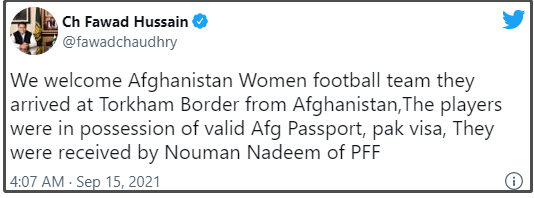 喬杜15日在推特上表示:“我們熱烈歡迎阿富汗國家青少年女子足球隊抵達巴基斯坦,球員們都持有有效的阿富汗護照以及巴基斯坦簽證,並且安排了巴基斯坦足球聯合會的代表進行接待工作。”