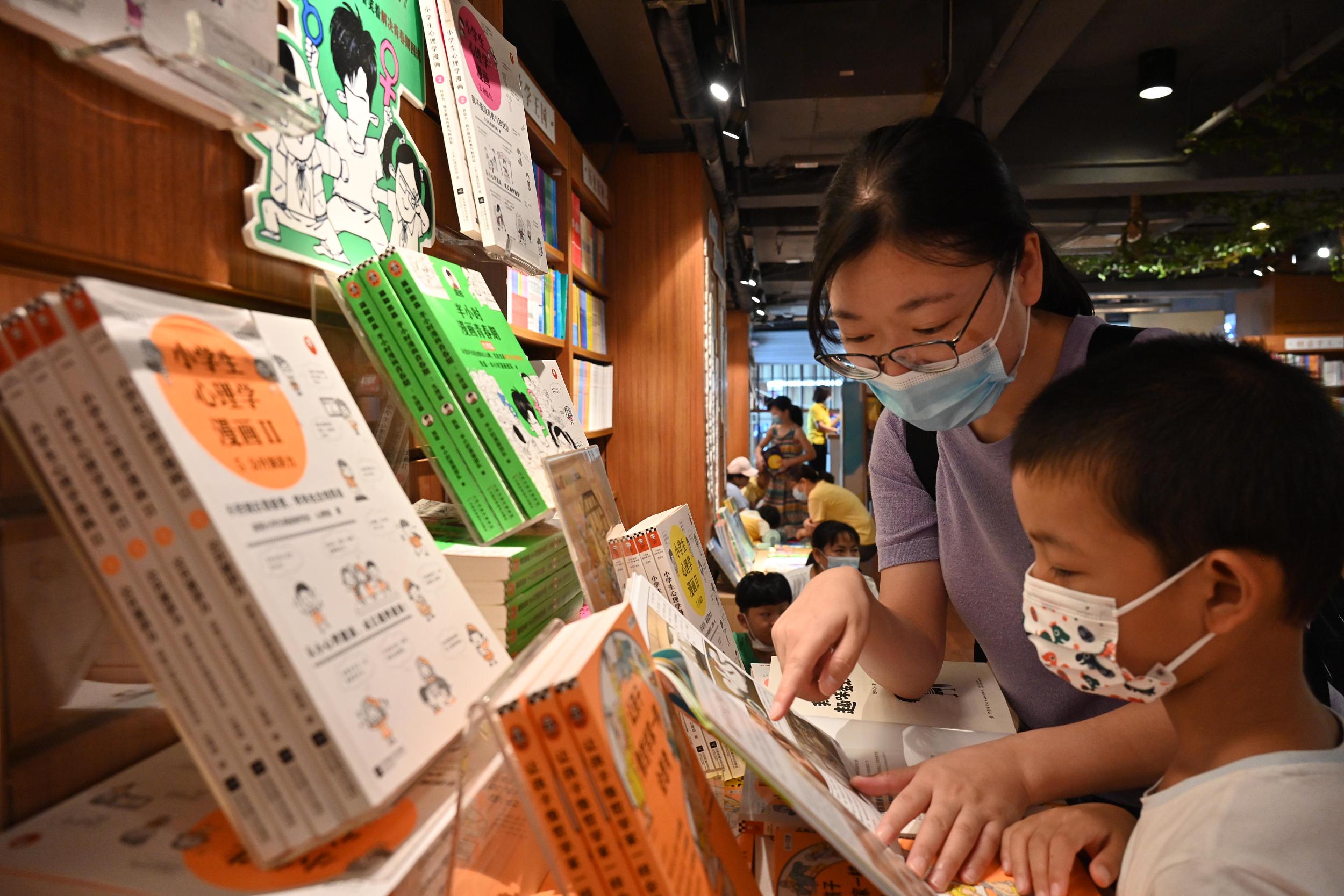 2021年9月11日,“雙減”政策落地之後,開學季的首個週末,在合肥市三孝口新華書店的少兒閲讀區,書店裏的小讀者和家長比平日多了許多。圖自視覺中國