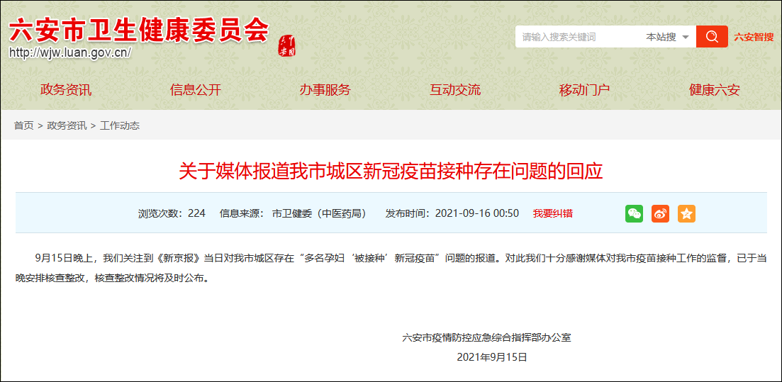9月16日,安徽省六安市衞健委網站發佈通報稱:9月15日晚上,我們關注到《新京報》當日對我市城區存在“多名孕婦‘被接種’新冠疫苗”問題的報道。對此我們十分感謝媒體對我市疫苗接種工作的監督,已於當晚安排核查整改,核查整改情況將及時公佈。