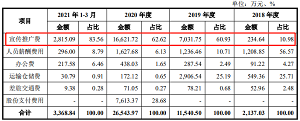 同期,該公司宣傳推廣費分別為234.64萬、7031.75萬和1.66億,佔銷售費用的比例分別為10.98%、60.93%和62.62%,呈現上升趨勢。