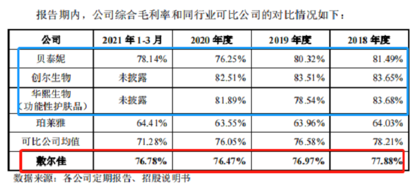 招股書顯示,敷爾佳綜合毛利率與同行毛利率均值基本持平。