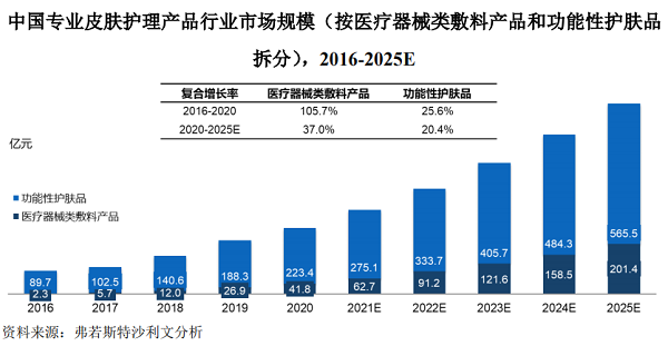 弗若斯特沙利數據顯示,功能性護膚品和醫療器械類敷料產品的市場規模由2016年的89.7億元和2.3億元增長至2020年的223.4億元和41.8億元,年均複合增長率為25.6%和105.7%。預計到2025年,功能性護膚品和醫療器械類敷料產品的市場規模將達到565.5億元和201.4億元。