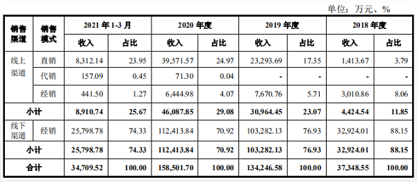 銷售渠道方面,敷爾佳主要以線下經銷為主,佔營業收入的七成以上。2018年至2020年,敷爾佳線下經銷營收為3.29億元、10.33億元和11.24億元,佔總營收的88.15%、76.93%和70.92%。