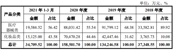 2018年至2020年,敷爾佳醫療器械類產品分別營收3.36億元、9.18億元、8.8億元,營收佔比分別達88.92%、68.38%、55.54%;化妝品類產品同期分別營收3765.73萬元、4.24億元、7.05億元,佔總營收的10.08%、31.62%、44.46%。