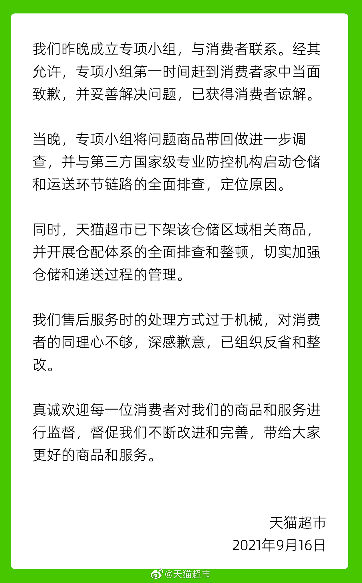天貓超市表示,在消費者投訴當晚,專項小組就將問題商品帶回做進一步調查,並與第三方國家級專業防控機構啓動倉儲和運送環節鏈路的全面排查,定位原因。同時,天貓超市已下架該倉儲區域相關商品,並開展倉配體系的全面排查和整頓,切實加強倉儲和遞送過程的管理。