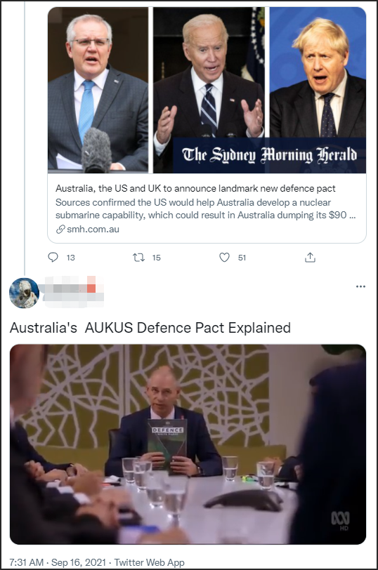三國建立新安全關係的推特新聞下方,網民又貼出電視劇《烏托邦》的片段,並評論道“澳大利亞的AUKUS協議就是這麼回事(explained)。”