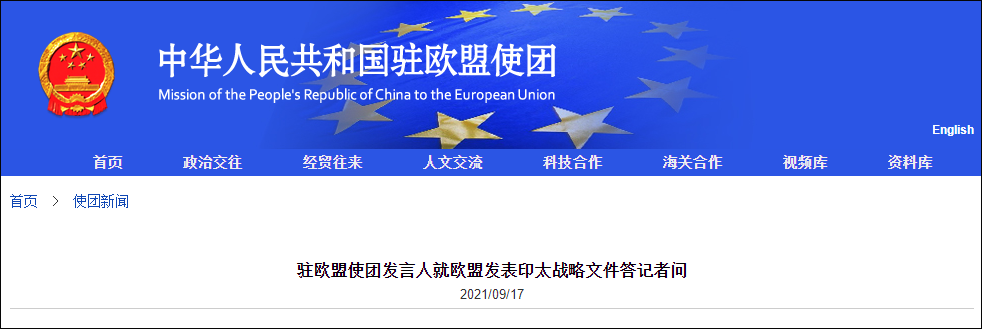 駐歐盟使團網站9月17日消息,駐歐盟使團發言人就歐盟發表印太戰略文件答記者問。