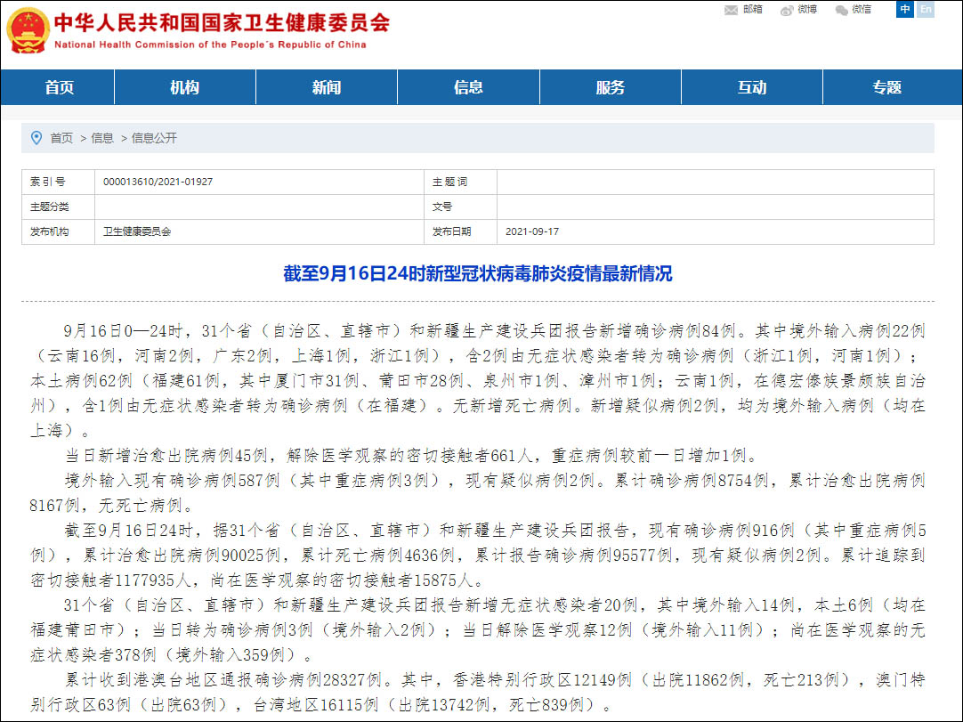 據國家衞健委官網9月17日消息,9月16日0—24時,31個省(自治區、直轄市)和新疆生產建設兵團報告新增確診病例84例。其中境外輸入病例22例(雲南16例,河南2例,廣東2例,上海1例,浙江1例),含2例由無症狀感染者轉為確診病例(浙江1例,河南1例);本土病例62例(福建61例,其中廈門市31例、莆田市28例、泉州市1例、漳州市1例;雲南1例,在德宏傣族景頗族自治州),含1例由無症狀感染者轉為確診病例(在福建)。無新增死亡病例。新增疑似病例2例,均為境外輸入病例(均在上海)。