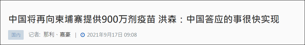 9日,洪森曾在廣西南寧舉辦的“第18屆中國-東盟博覽會”開幕式上感謝在疫情期間向柬埔寨提供無私援助的中國政府和人民,他稱“在中國朋友的幫助下,柬埔寨即將建起羣體免疫屏障,有望在短期內逐步開放社會經濟活動”。除此之外,他還高度讚揚了中國為全球抗疫作出重大貢獻,以及通過生產和分享疫苗,提供醫療設備和分享預防、護理和治療的經驗。