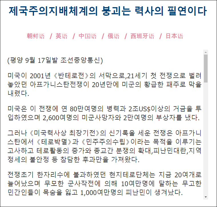 (觀察者網訊)17日,朝中社刊發朝鮮國際問題研究院研究員李成根就美國在阿富汗行動的評論,稱“帝國主義統治體系土崩瓦解是歷史的必然”。