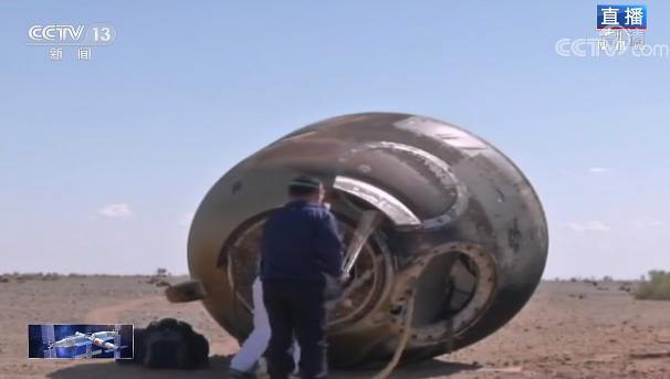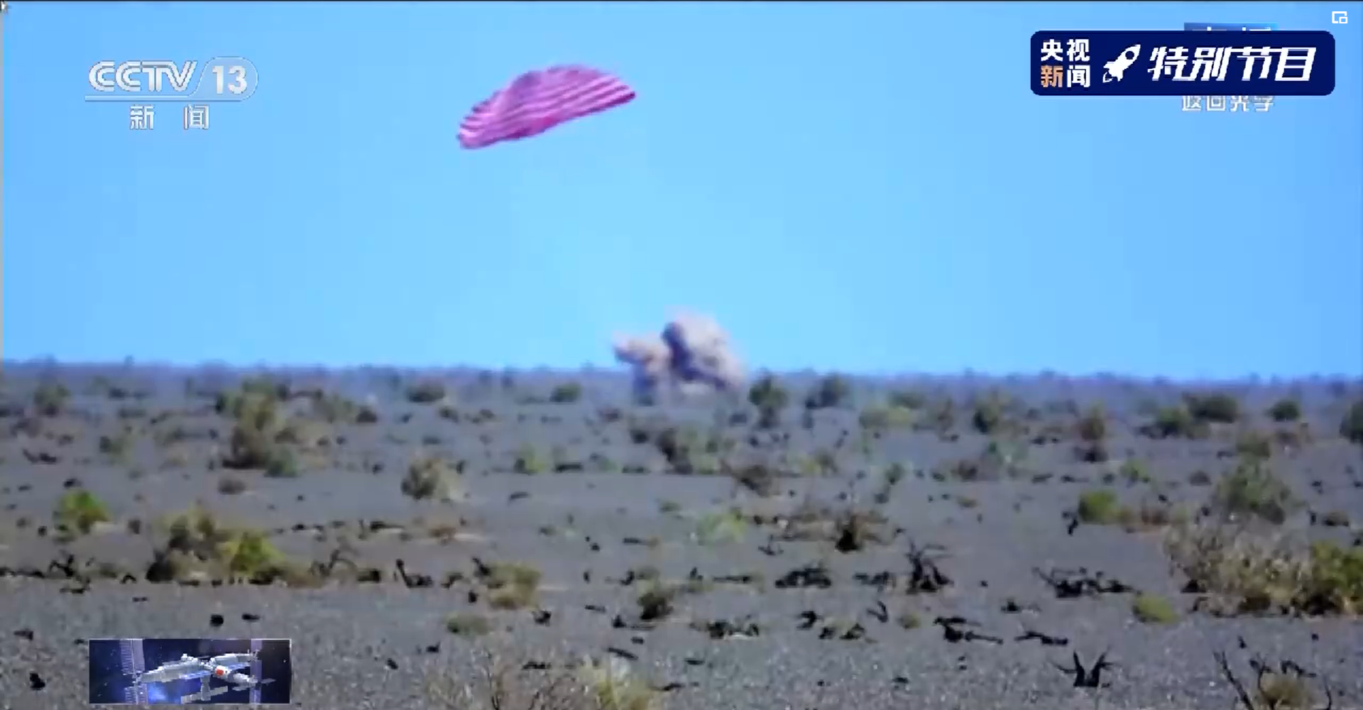 13時24分,返回艙乘傘降落,距離地面6公里左右,返回艙拋防熱大底