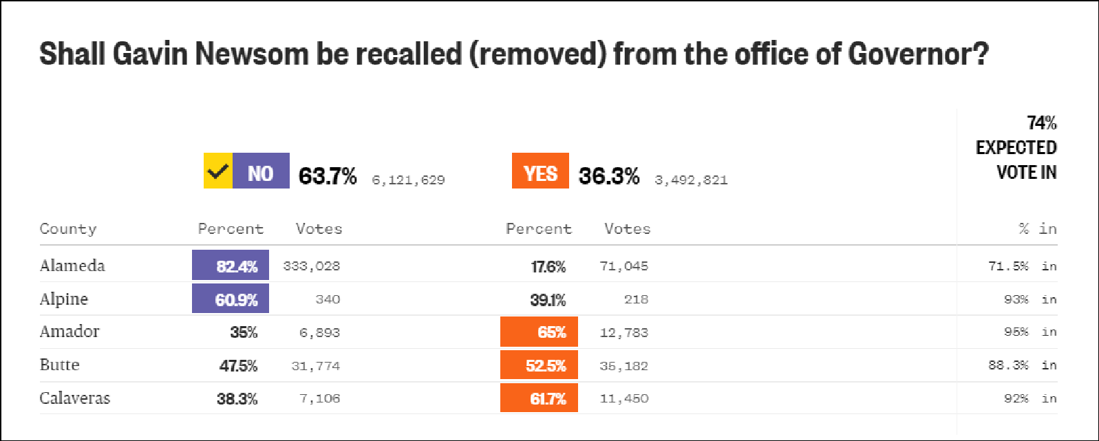 據全美廣播公司(NBC)消息,截至當地時間9月16日晚10時20分,在已統計完畢的74%選票中,紐森的支持率為63.7%。