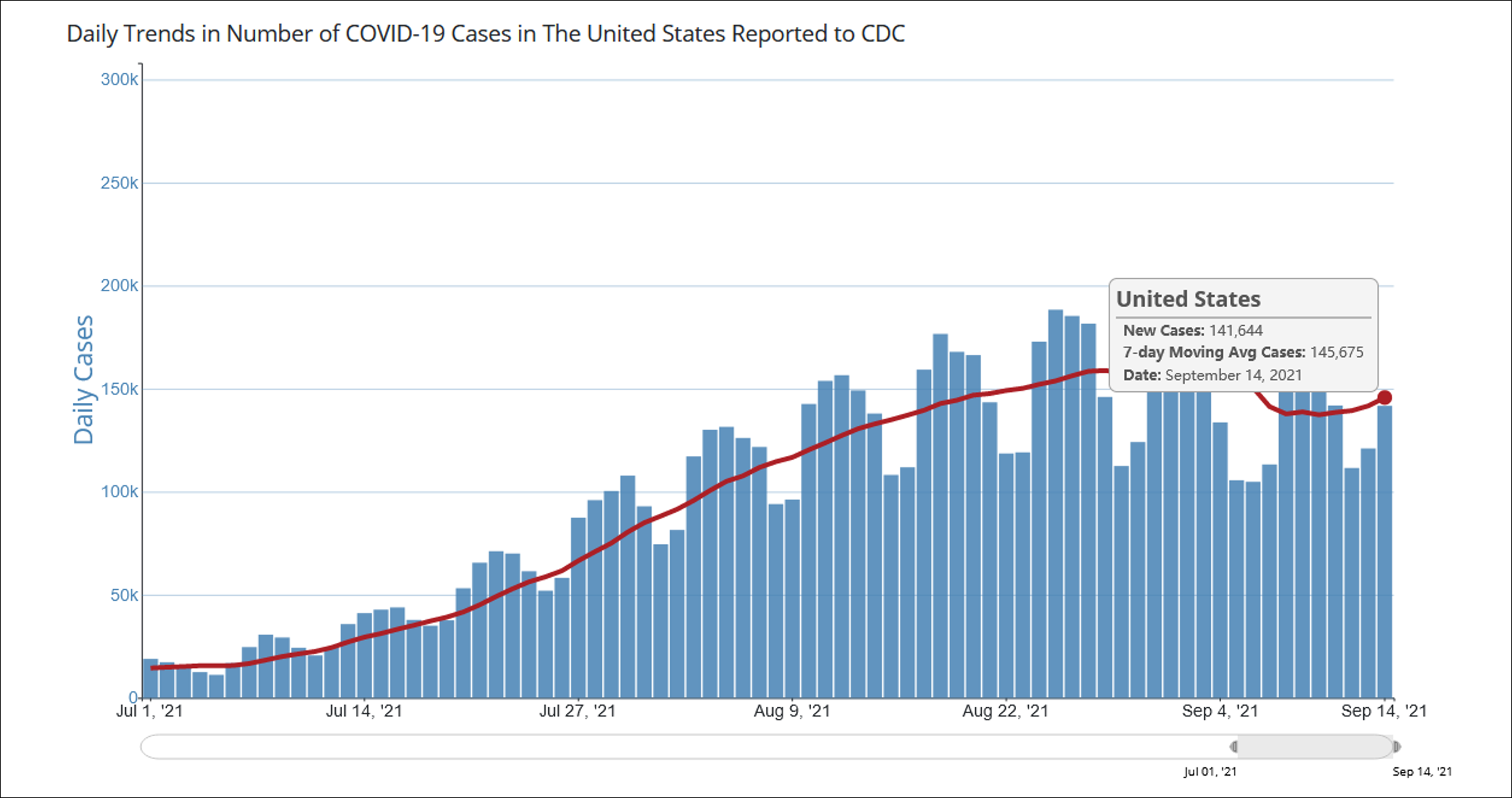 美國7月1日至9月14日單日新增確診病例變化 圖源:CDC網站截圖