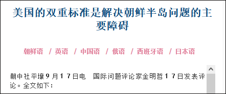 朝中社文章稱,美國把朝鮮的自衞性活動定性為針對某一方、選擇特定時機進行的“武力挑釁”,並惡意指責朝鮮“對國際和平和安保構成威脅”,這集中體現着典型的美國式雙重標準。