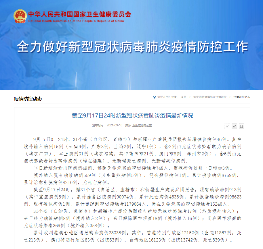 據國家衞健委9月18日消息,9月17日0—24時,31個省(自治區、直轄市)和新疆生產建設兵團報告新增確診病例46例。其中境外輸入病例15例(雲南9例,廣東3例,上海2例,遼寧1例),含2例由無症狀感染者轉為確診病例(均在廣東);**本土病例31例(均在福建,其中莆田市21例、廈門市8例、漳州市2例),含6例由無症狀感染者轉為確診病例(均在福建)。**無新增死亡病例。無新增疑似病例。