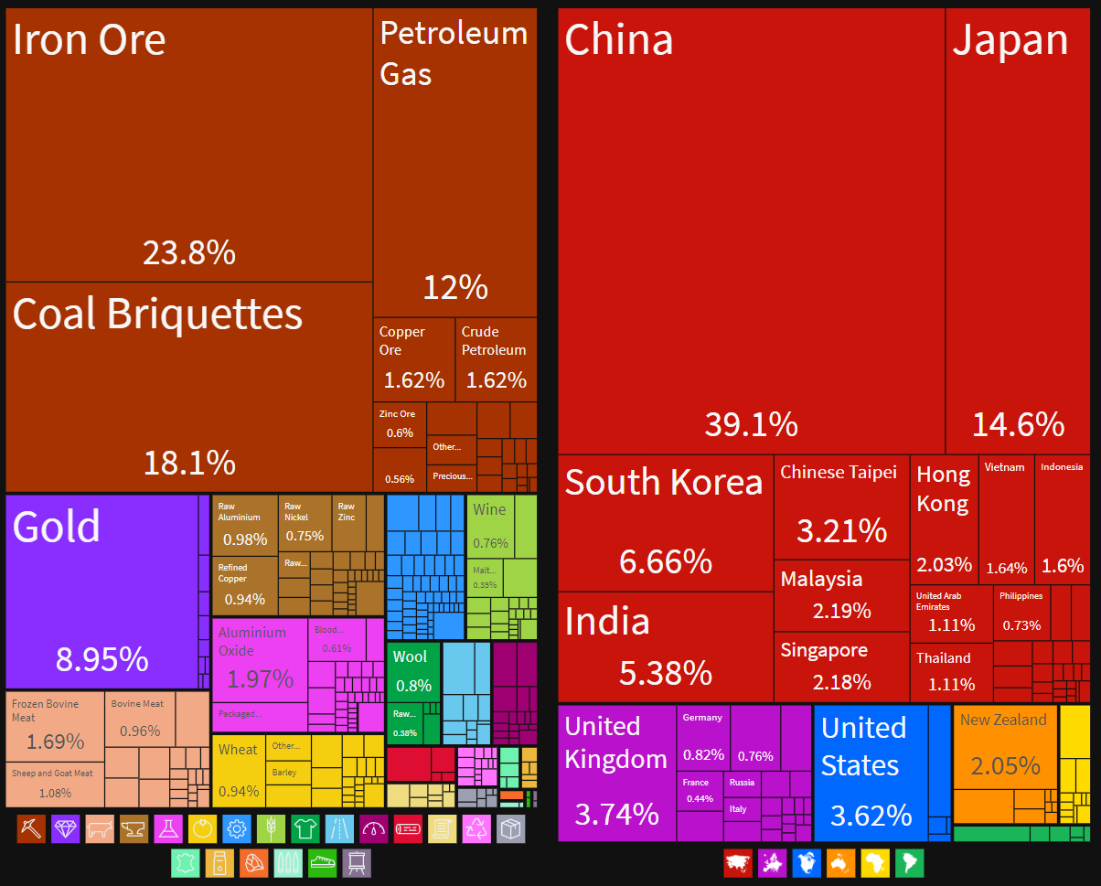 2019年澳大利亞出口分類比重(左)和目的地比重(右)(圖源:oec.world)