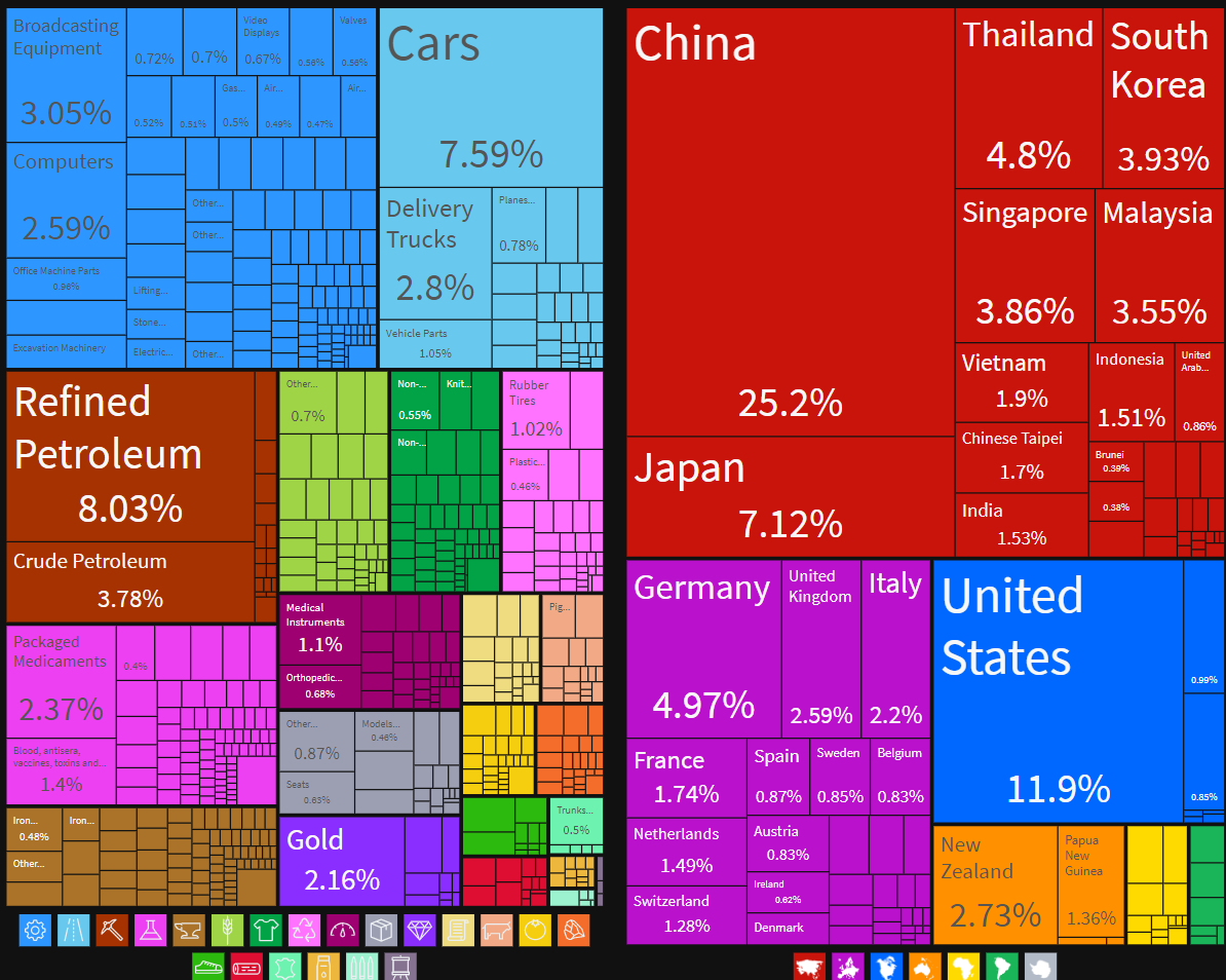 2019年澳大利亞進口分類比重(左)和來源地比重(右)(圖源:oec.world)