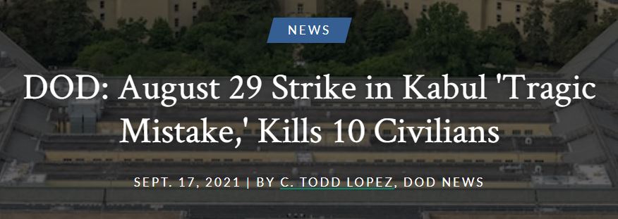 當地時間17日,美國中央司令部司令肯特·麥肯齊(Kenneth F. McKenzie)承認,五角大樓的調查顯示,美軍8月29日在阿富汗喀布爾進行的此前被稱為“正義打擊”的空襲,實際上並未擊斃所謂的“恐怖分子”,反而誤殺了10名平民,其中包括7名阿富汗兒童。