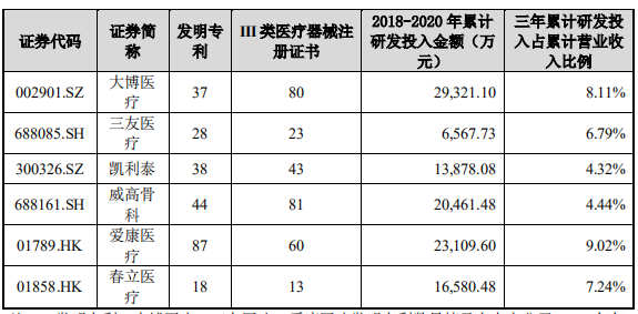 從研發費用來看,2018年至2020年春立醫療研發費用率分別為7.12%、6.75%和7.74%,與同行研發投入平均水平相差不多。