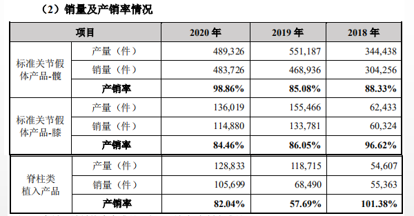 2018年至2020年,春立醫療髖關節假體產品分別銷售30.43萬件、46.89萬件、48.37萬件;膝關節假體分別銷售6.03萬件、13.38萬件、11.49萬件;脊柱類植入產品分別銷售5.54萬件、6.85萬件、10.57萬件。