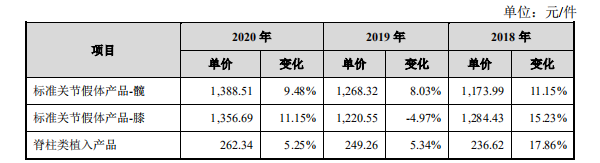 2018年至2020年,該公司髖關節假體產品由1173.99元/件漲至1388.52元/件,累計漲幅約18.27%;脊柱植入產品由236.62元/件漲至262.34元/件,累計漲幅約1087%;另一項膝關節假體產品也只有在2019年小幅度下降。