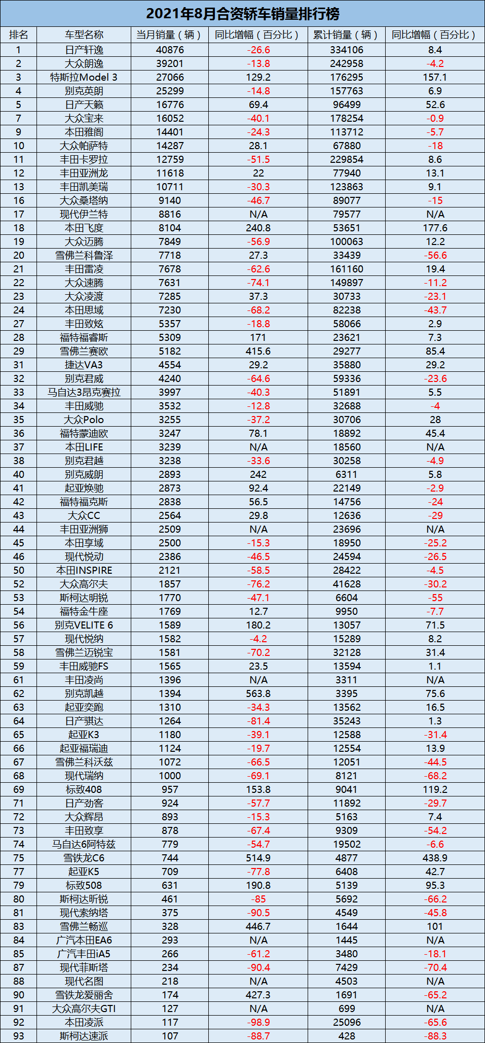 **附:**2021年8月合資品牌轎車銷量排行榜: