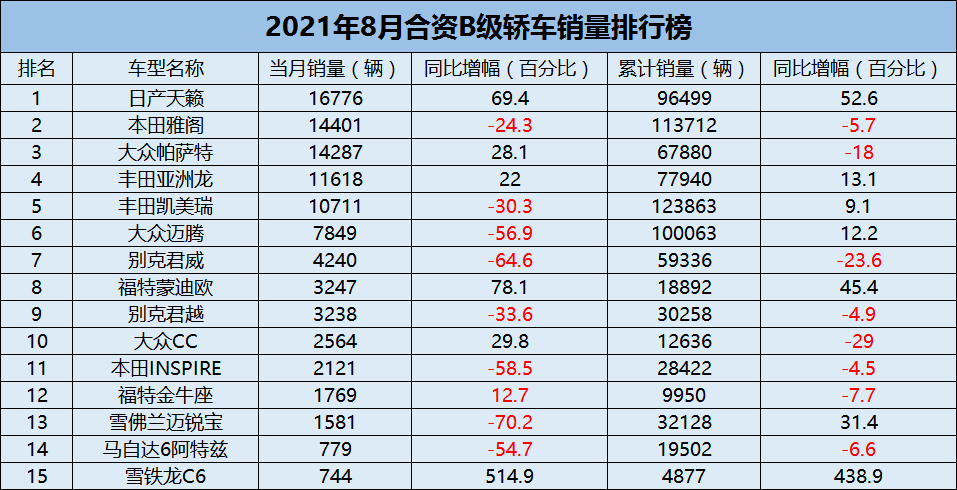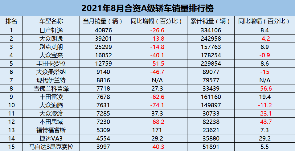 車市月觀察 | 8月合資轎車:芯片荒重創日系,帕薩特重回前十