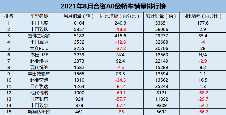 其中,日系獨佔8款,豐田、本田各3款,日產2款。自去年8月上市的本田全新一代飛度,不出意外地成為A0級合資轎車市場的銷量冠軍,較同期上市時增長了240%。