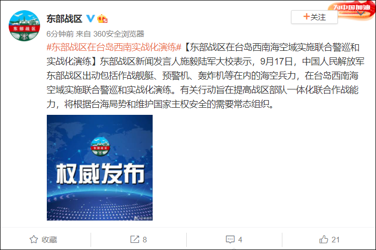 @東部戰區 9月18日消息,東部戰區新聞發言人施毅陸軍大校表示,9月17日,中國人民解放軍東部戰區出動包括作戰艦艇、預警機、轟炸機等在內的海空兵力,在台島西南海空域實施聯合警巡和實戰化演練。有關行動旨在提高戰區部隊一體化聯合作戰能力,將根據台海局勢和維護國家主權安全的需要常態組織。
