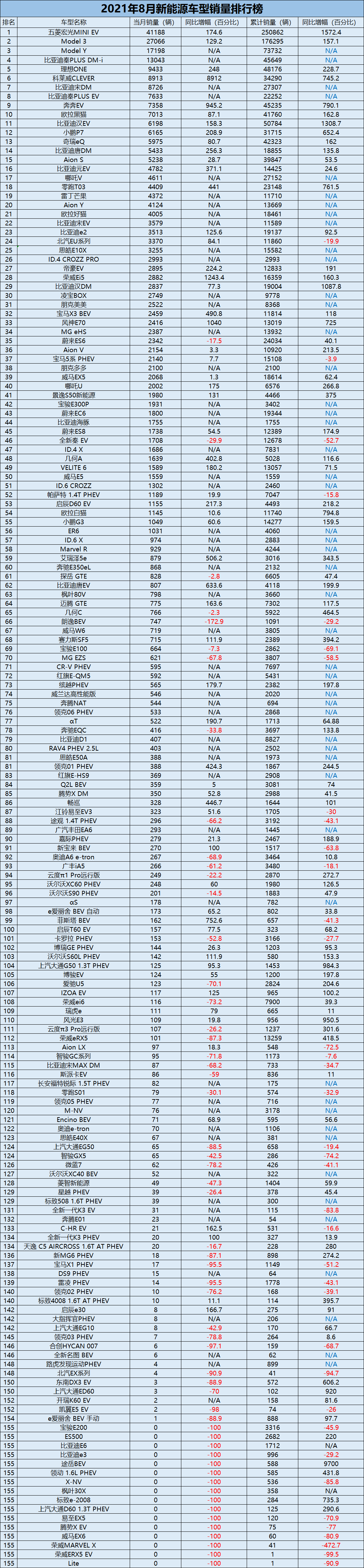 8月,國內新能源產品共出售25萬輛,同比增長168%。1-8月累積銷量共出售148萬輛,同比增長202.4%。