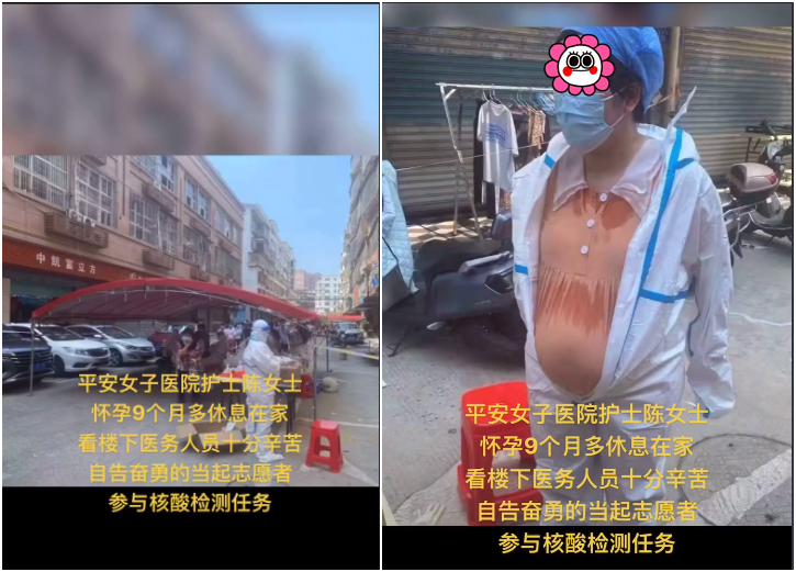 其中一段點贊數超過2000的視頻配文稱“平安女子醫院護士陳女士懷孕9個多月休息在家,看樓下醫務人員十分辛苦,自告奮勇地當起志願者,參與核酸檢測任務”。