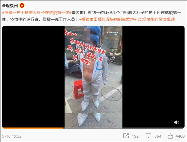 9月15日,一張名為“福建一護士挺着大肚子在抗疫一線”的照片在短視頻平台走紅,相關視頻配文稱“最美醫護人員”“為大肚子白衣天使點贊”,熱門視頻點贊數超過24萬。