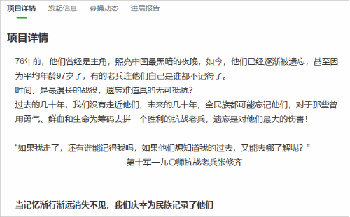 此外,該頁面頂部信息為“收集、傳播老兵故事,讓善舉累加,成為守護的力量”,“項目詳情”部分則首先為對抗戰老兵的長段介紹,“項目預算”“項目執行計劃”“善款用途”等信息則位於末尾部分。