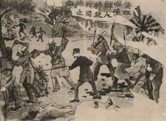 反映萬寶山事件的漫畫。九一八事變發生前,日本在吉林省萬寶山村刻意策劃,事件意在引發中國與朝鮮民眾間的衝突,為後續侵佔東北三省的計劃佈局。