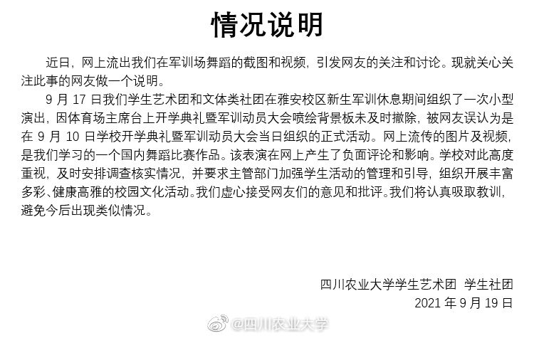 9月19日,四川農業大學官方微博發佈由四川農業大學學生藝術團、學生社團提供的《情況説明》稱,近日,網上流出該校在軍訓場舞蹈的截圖和視頻,引發網友的關注和討論。現就關心關注此事的網友做一個説明: