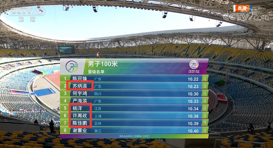晉級名單上,預賽成績前7名的選手中有4人來自蘇炳添這組,蘇炳添位列預賽第二,第一名是其廣東隊友陳冠鋒,成績為10秒22。