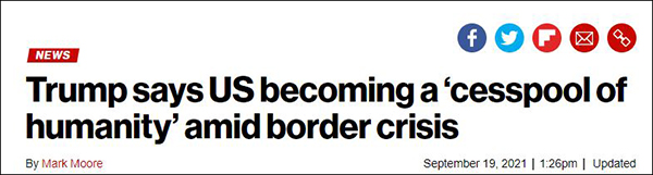 近日,成千上萬名來自海地的非法移民涉水穿過美國與墨西哥邊境河流,湧入美國。這不但令美國政府十分頭疼,也令前總統特朗普“痛心不已”。在此情況下,特朗普不惜從自己的詞庫中掏出“糞坑”(cesspool)一詞來形容如今面對非法越境人潮的美國。