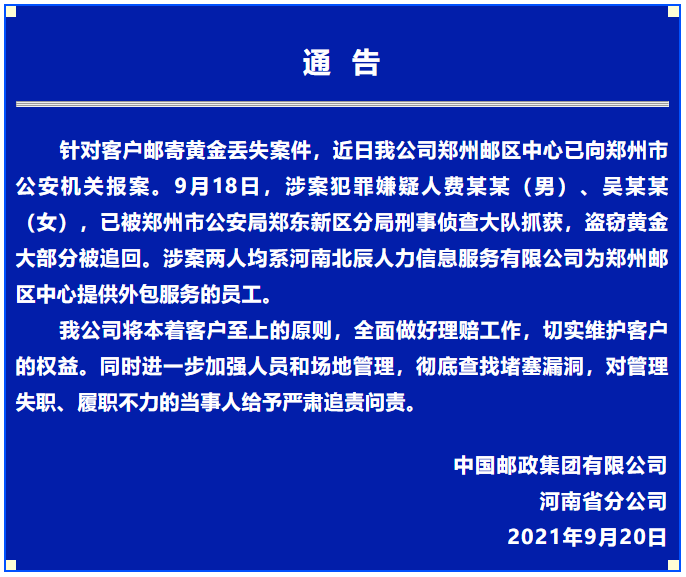 據“河南郵政”微信公號9月20日消息,針對客户郵寄黃金丟失案件,近日公司鄭州郵區中心已向鄭州市公安機關報案。9月18日,涉案犯罪嫌疑人費某某(男)、吳某某(女),已被鄭州市公安局鄭東新區分局刑事偵查大隊抓獲,盜竊黃金大部分被追回。涉案兩人均系河南北辰人力信息服務有限公司為鄭州郵區中心提供外包服務的員工。