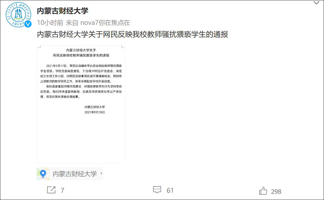 通報指出,2021年9月17日,網民在自媒體平台反映內蒙古財經大學教師騷擾猥褻學生信息。學校黨委高度重視,於當晚19時召開黨委會,決定成立專項工作小組,對網民反映事項迅速開展調查核實;同時停止該教師的教學研究工作,並責令其配合學校開展調查。