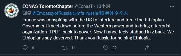 但也有不少表明埃塞俄比亞身份的網民,批評説:“法國正與美國合謀干涉,並迫使埃塞俄比亞政府在西方勢力面前下跪,讓恐怖組織‘提格雷人民陣線’重新掌權。現在法國感覺自己被捅了一刀,我們埃塞俄比亞人説這很值得。感謝俄羅斯幫助埃塞俄比亞。”