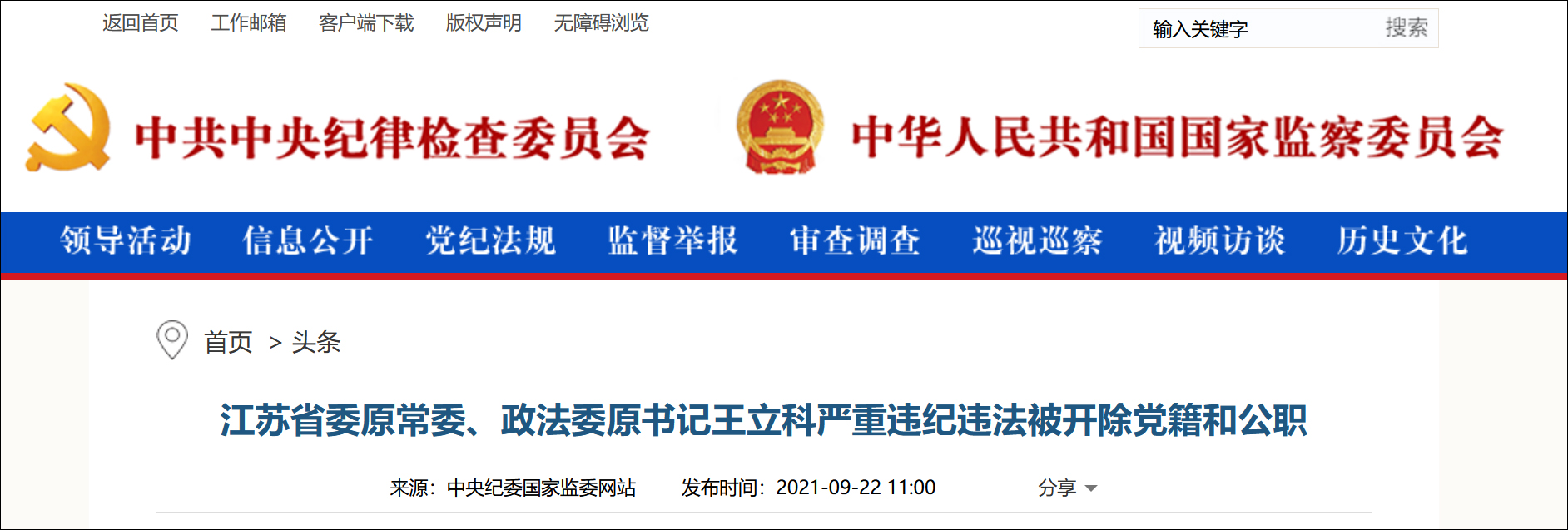 江蘇省委原常委、政法委原書記王立科被開除黨籍和公職