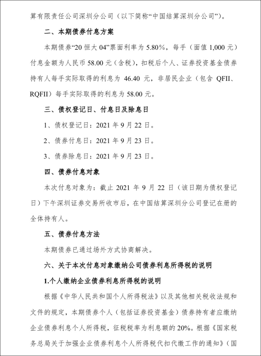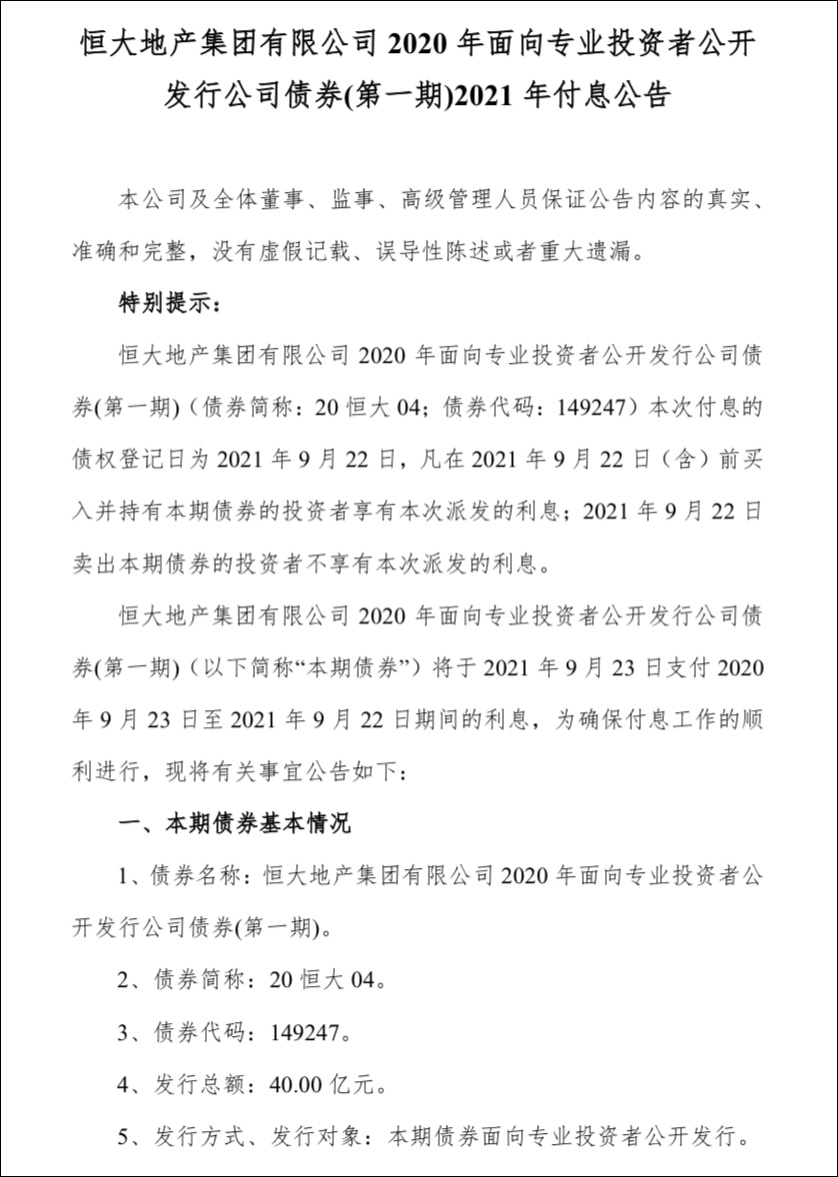 據深交所網站9月22日消息,9月22日,恒大地產集團有限公司發佈2020年面向專業投資者公開發行公司債券(第一期)2021年付息公告:20恒大04債券將於2021年9月23日支付2020年9月23日至2021年9月22日期間的利息。